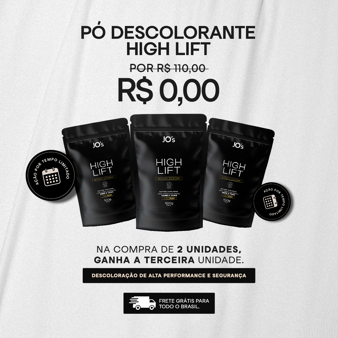 Para descoloração total: Recomenda-se uso de uma medida 50g do Pó Descolorante Branco High Lift Bleach Powder Jo’s, acrescentando 150ml de água oxigenada de 6, 10, 20, 30 ou 40 volumes. A aplicação deverá ser feita sobre os cabelos secos e não lavados, iniciando a aplicação na nuca ou nas partes mais escuras.